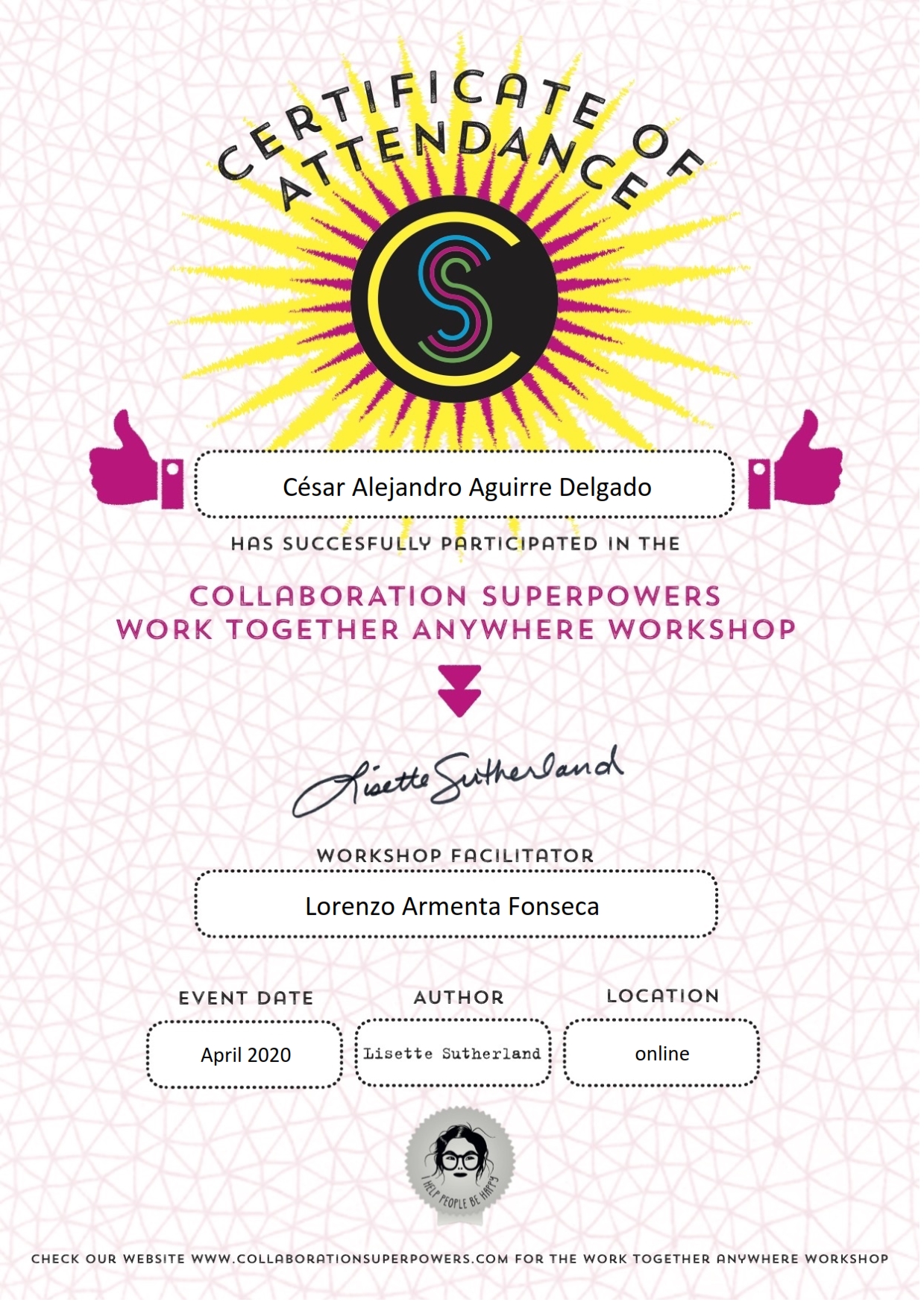 - Certificado. Certificate of Attendance del workshop avalado por Collaboration Superpowers.